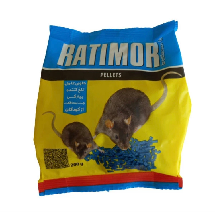 طعمه موش کش راتیمور با ماده موثره برودیفاکوم 0.005 درصد به شکل پلیت ساخت شرکت Unichem کشور Slovenia در بسته بندی های 200 گرمی تولید شده است .